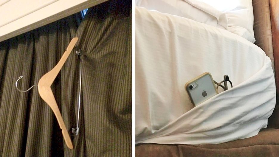 Większość pokoi hotelowych jest wyposażona w co najmniej kilka wieszaków na spodnie, dlatego też możesz ich użyć do złapania zasłon. Dzięki temu rano nie będziesz martwić się promieniami słonecznymi, które mogą obudzić Cię po ciężkiej podróży.