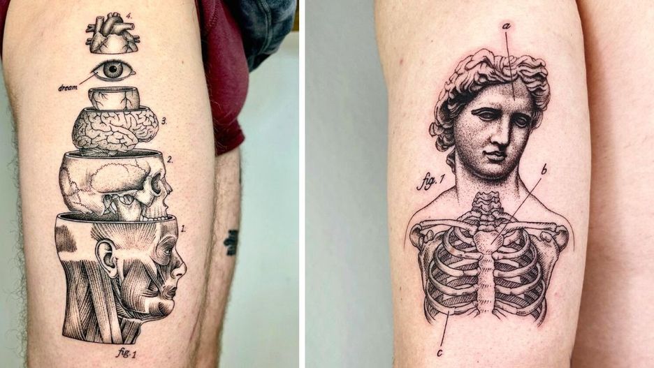 23 monochromatyczne tatuaże, które wyglądają jak szkice z medycznych i naukowych czasopism