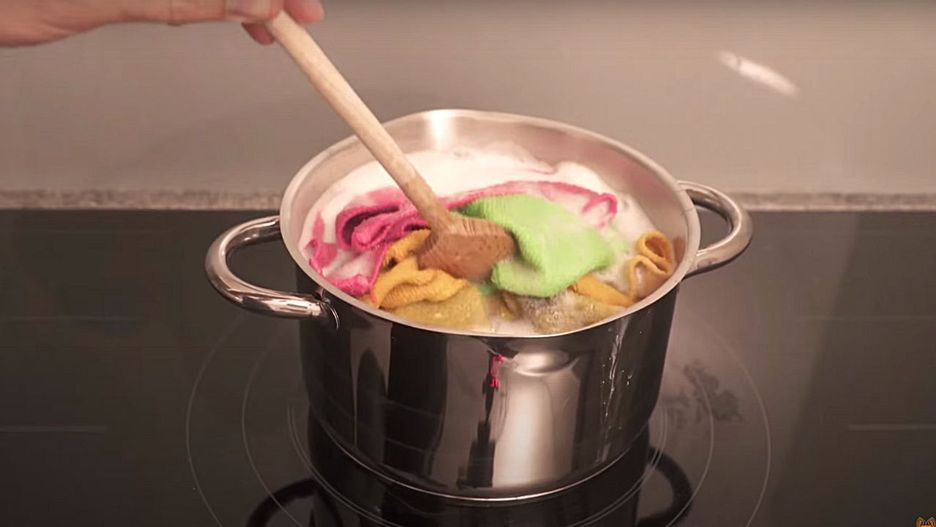 Najpierw weź dość wysoki garnek i napełnij go gorącą wodą. Powinna zająć 2/3 jego objętości. Naczynie postaw na kuchence, a do wody włóż wszystkie brudne szmatki. Później do garnka wlej szklankę octu, trochę płynu do mycia naczyń oraz dodaj szklankę sody oczyszczonej. Całość gotuj przez ok. 5-8 minut. Pamiętaj, aby wówczas cały czas mieszać gotujące się ściereczki.