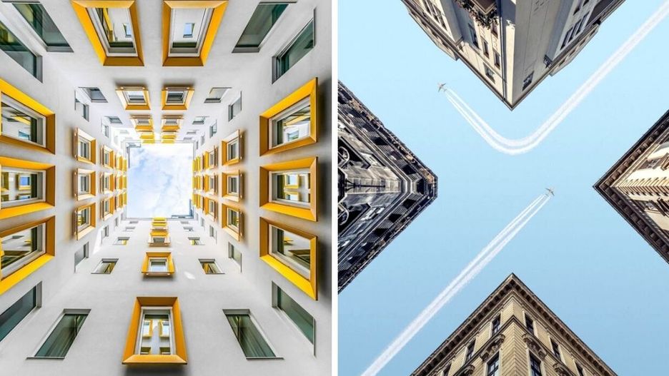 17 budynków sfotografowanych od dołu w hołdzie miłość do symetrii
