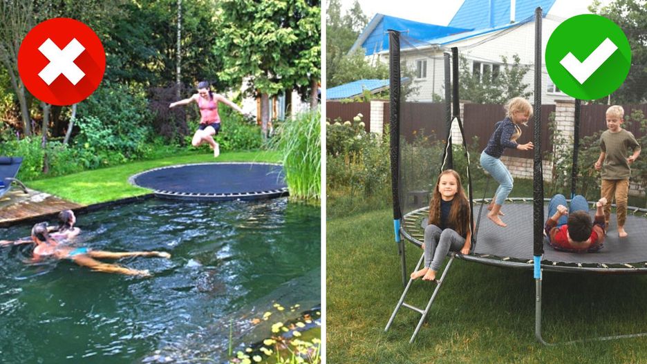 Jeśli już ustawisz trampolinę, rób to z dala od basenu, zraszacza, kurtyny wodnej i innych wodnych atrakcji w ogrodzie!