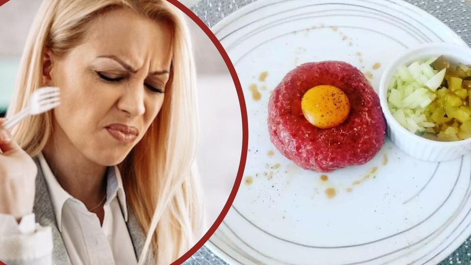 Czyli surowe mięso i surowe jajko podane na talerzu z cebulą i ogórkami. Gorzej być nie może, co nie? I nie pomaga powiedzenie, że po takim daniu najlepiej wypić kieliszek wódki... Apetyt i tak został już odebrany.