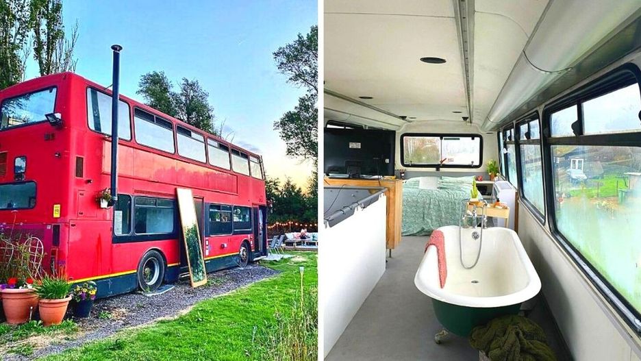 Dwupiętrowy autobus zamieniony w dom z kominkiem i wanną! Rewelacyjne wnętrze zachwyca