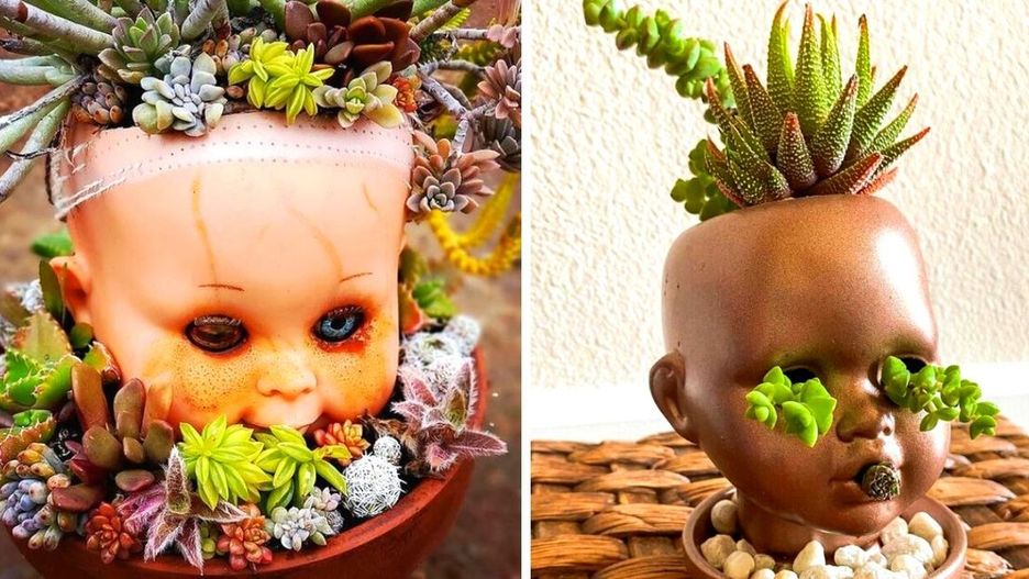 15 osobliwych i trochę strasznych doniczek zrobionych z główek i korpusów lalek. Dla fanów niecodziennych dekoracji