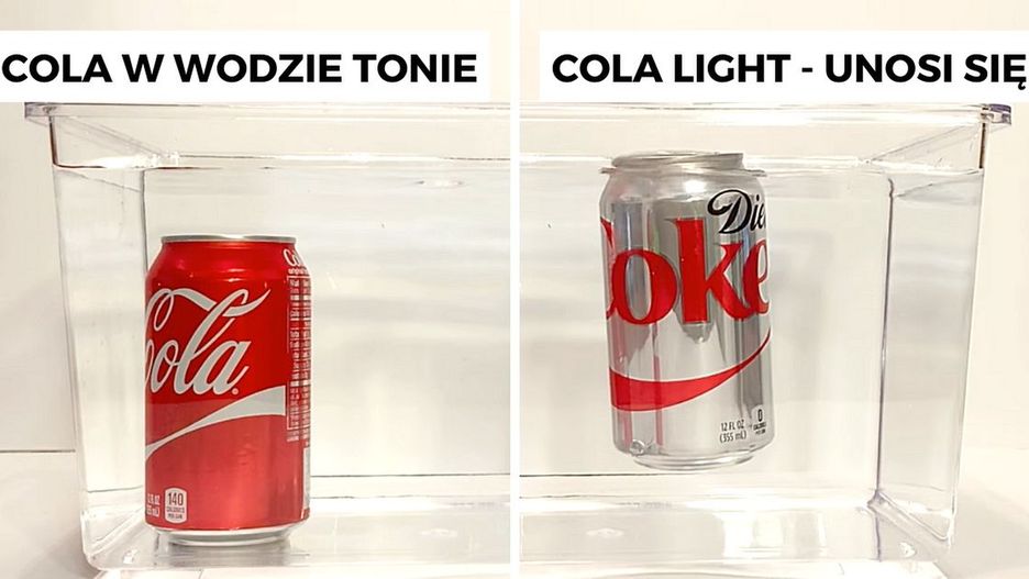 #16 Coca-cola wrzucona do wody - zatonie. Natomiast cola light będzie unosić się na jej powierzchni. Cukier po prostu jest cięższy niż słodziki używane w coli light