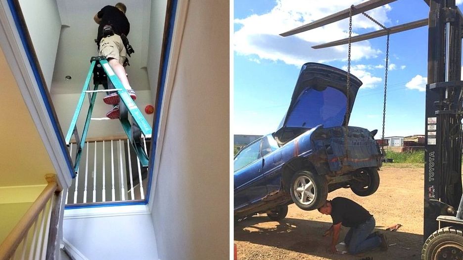 Niektórzy mężczyźni zupełnie ignorują zasady BHP i w pracy uprawiają prawdziwe sporty wyczynowe. Są nawet tacy, który pretendują do miana cyrkowców, a przy pomocy drabiny wejdą niemal wszędzie. Zdjęcia w galerii mrożą krew w żyłach i zastanawiam się jak, w niektórych sytuacjach, udało się pracownikom ujść z życiem...