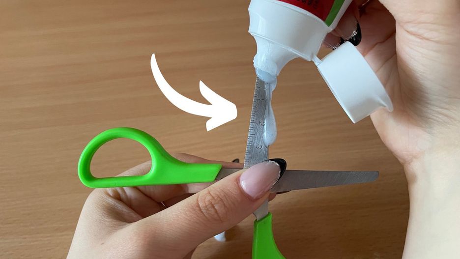 - Nałóż pastę do zębów na powierzchnie tnące nożyczek. Porządnie rozsmaruj preparat, by pokrywał je w całości.