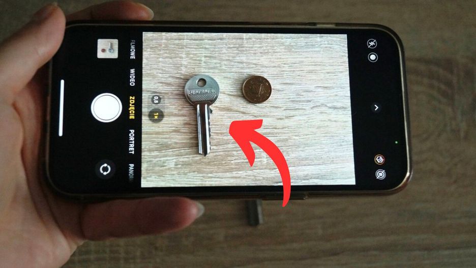 - Zdjęcie musi zostać wykonane w odpowiedni sposób, by klucz miał na nim swój naturalny rozmiar. Dla zachowania skali użyj dwóch monet o dowolnym (ale jednakowym) nominale. Jedną z nich ułóż obok klucza, a drugą na ekranie telefonu. Ustaw aparat tak, by moneta na stole dokładnie pokrywała się z tą na telefonie.