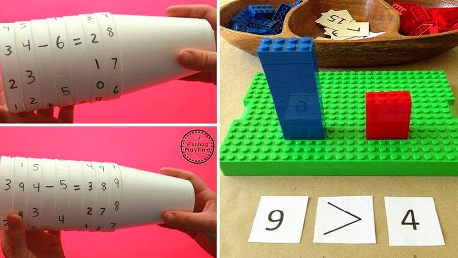 #10 Można stworzyć prosty "kalkulator" z użyciem kubków. Napisz cyfry od 0 do 9 na krawędziach trzech z nich. Na pozostałych dwóch narysuj znaki matematyczne: dodawanie, odejmowanie, dzielenie, mnożenie i znak równości. Następnie zgrupuj je w odpowiedniej kolejności i podstawowe liczenie będzie niezwykle intrygujące dla twojego dziecka