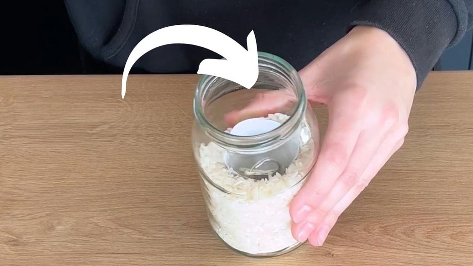 1. Do środka małego słoika włóż rolkę po papierze toaletowym. Następnie pustą przestrzeń między rolką a ściankami naczynia wypełnij dowolnym produktem spożywczym (najlepiej ryżem lub kaszą, ale dobrze sprawdzi się też cukier). Słoik wstaw do szafki kuchennej pomiędzy inne pojemniki z jedzeniem.
