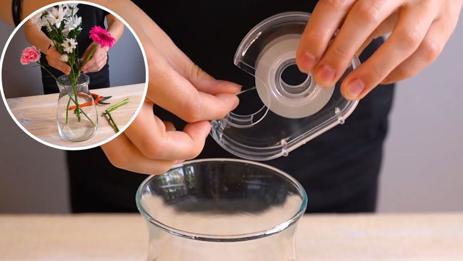 Taśmę klejącą trzeba pociąć na kawałki dłuższe niż średnica wazonu. Nalać do niego wodę i osuszyć krawędzie. Następnie, z pociętej taśmy trzeba wykonać siatkę na szczycie wazonu. Otwory nie mogą być za małe, żeby łodygi kwiatów mogły przez przejść.