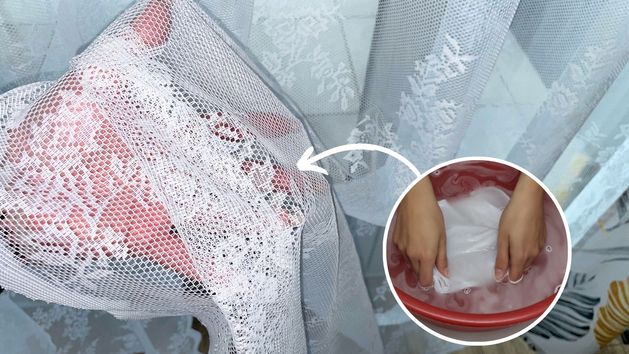 - Namaczaj firany w roztworze przez 5 do 7 minut. Całe powinny być zalane wodą.