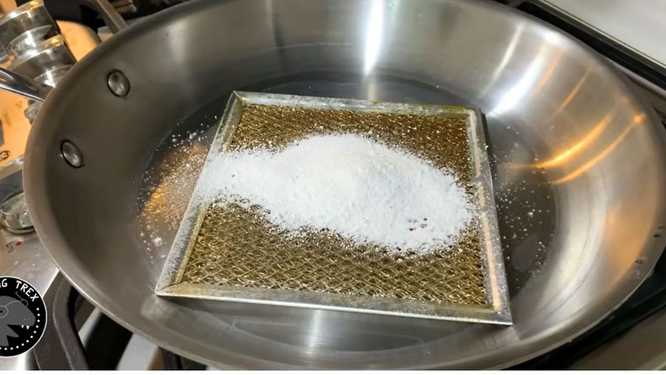 Wiemy, że to może brzmieć trochę dziwnie, ale umycie filtrów z okapu na patelni to naprawdę genialny patent. Umieść filtr w naczyniu, a następnie dodaj detergent do zmywarki. Jeśli używasz proszku, wsyp 2 łyżki, jeśli korzystasz z kapsułek, również użyj 2 sztuk. Następnie zalej wszystko kilkoma kubkami gorącej wody. Kratka z okapu musi być zanurzona na kilka centymetrów. Podgrzewaj patelnię z filtrem zanurzonym w wodzie z detergentem na wolnym ogniu przez 20-25 minut. W międzyczasie możesz kilka razy przełożyć kratkę na drugą stronę, używając kuchennych szczypiec. Po upływie wskazanego czasu wyjmij kratkę z wody (również za pomocą szczypiec). Będzie wyglądać jak nowa! Opłucz ją pod czystą wodą i wysusz, a następnie zainstaluj w okapie.