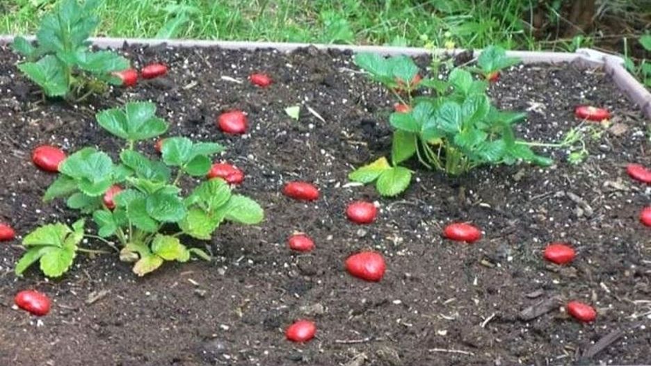 To super pomysł, którego autorem jest anonimowy ogrodnik - autor powyższego zdjęcia. Postanowił on, przed pojawieniem się owoców i warzyw na swoich grządkach, pomalować kilka garści kamieni na czerwono i rozrzucić je po swoim ogrodzie. Ptaki-szkodniki oczywiście jak tylko zauważyły soczyście czerwone "owoce", natychmiast spróbowały je zjeść. Oczywiście przygoda z kamieniami zakończyła się dla nich bardzo przykrym doznaniem. Na dodatek czerwone kamienie sprawiły, że ptaki zapamiętały, że z owocami z tego ogródka jest coś nie tak i od tej pory go omijają.
