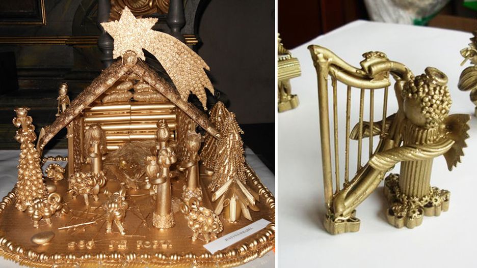 Cała praca przy żłobku polega na sklejaniu makaronu gorącym klejem i spryskaniem gotowych elementów złotem w sprayu.