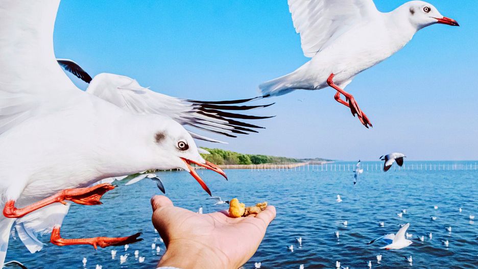 Mewy nad morzem jedzą mi z ręki. Chcę je dokarmić, a inni mówią, że przez to im szkodzę