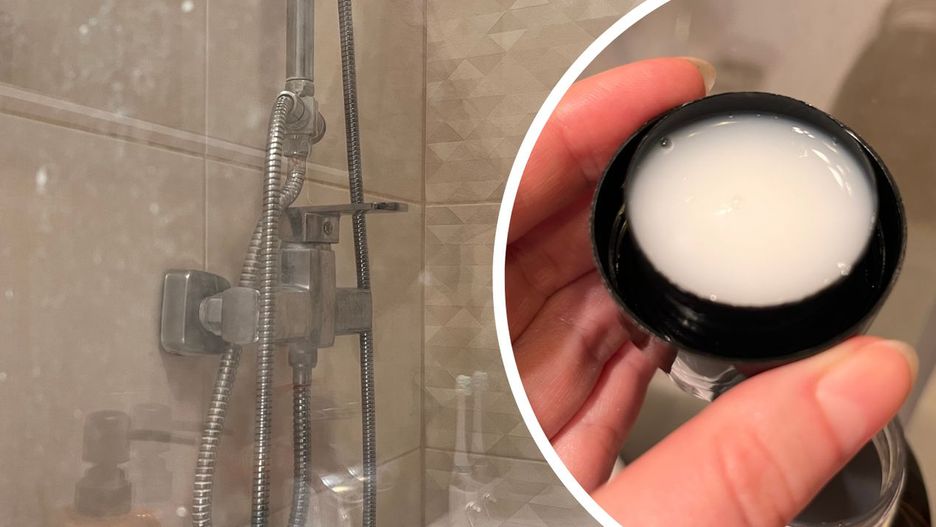 Mieszam z wodą i myję prysznic. Kamień sam się rozpuszcza i spływa z całej powierzchni!