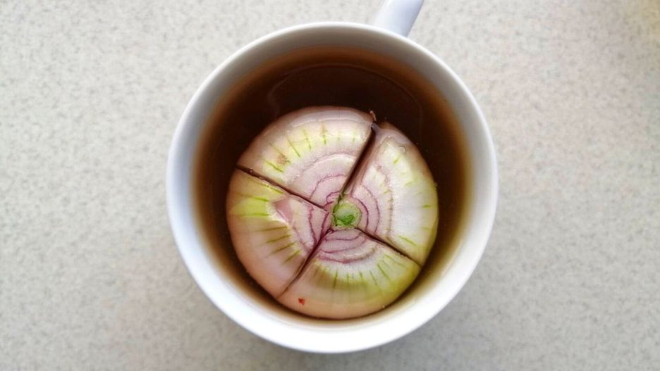 Najpierw jedną białą cebulę obierz ze skórki. Późnij dobrze ją umyj i zrób w niej nacięcie na kształt krzyża (pilnuj tylko, aby w całości się nie rozpadła, gdyż nacięcie ma być płytkie). Dzięki temu cebula zacznie uwalniać swoje soki. W kubku zaparz czarną herbatę.