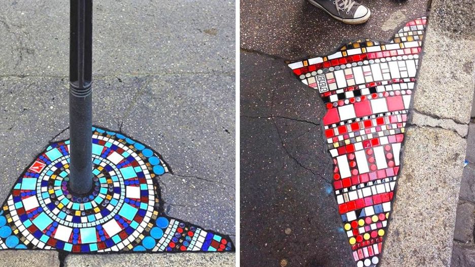 Ememem to francuski artysta, który w nietypowy sposób postanowił zwrócić uwagę na zły stan dróg i chodników w swoim rodzinnym mieście (francuskie Lyon). Wszelkie wyrwy, dziury w jezdniach i uszczerbki w murach wypełnia kolorowymi mozaikami. Gratulacje za dużą inwencję twórczą!