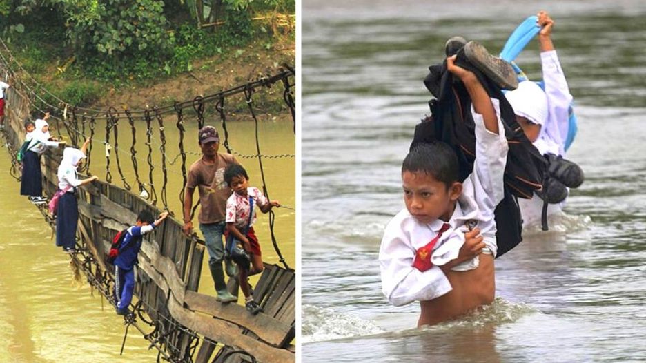 3. W Zachodniej Sumatrze (Indonezja) uczniowie, mieszkający we wsi Nagari Koto Nan Tigo, muszą codziennie przekraczać rzekę w bród. Wszystko dlatego, że nie wybudowano mostu.