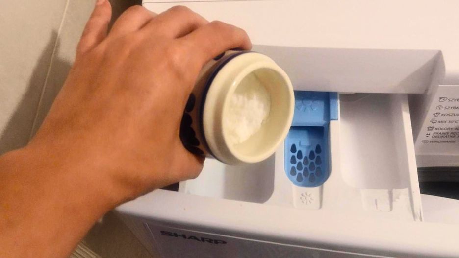 - Wsyp do szuflady 1–2 łyżki stołowe domowego proszku do prania.