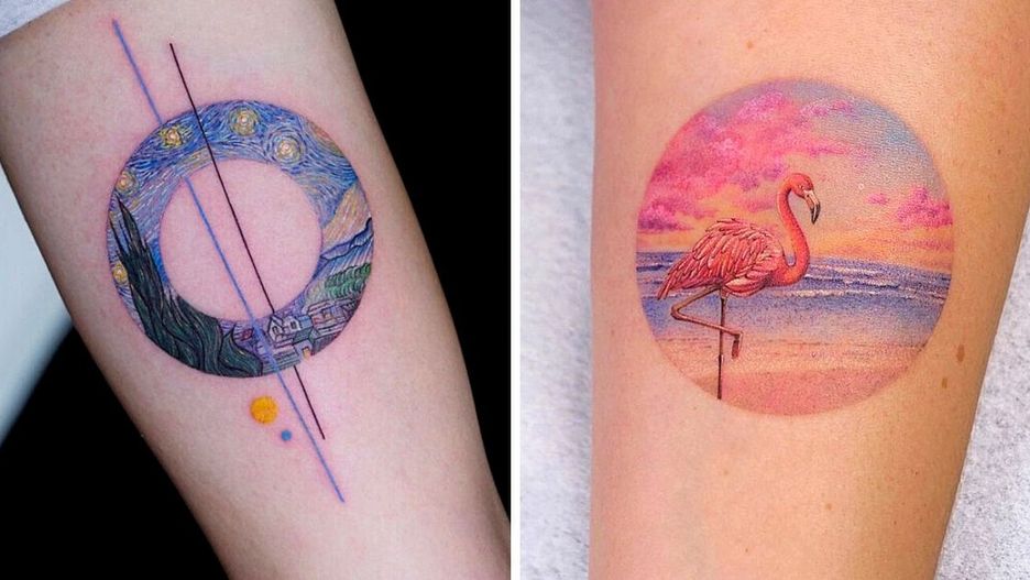 19 okrągłych tatuaży, które wyglądają jak okna do innego świata. Kolorowe wzory z malarskim sznytem