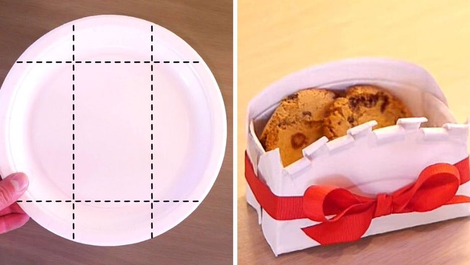Jeśli w kuchennej szafce nie masz akurat jednorazowych toreb, folii aluminiowej czy chociażby plastikowych siatek, to pudełko na słodkości i inne przekąski możesz w łatwy sposób zrobić z papierowego talerzyka.