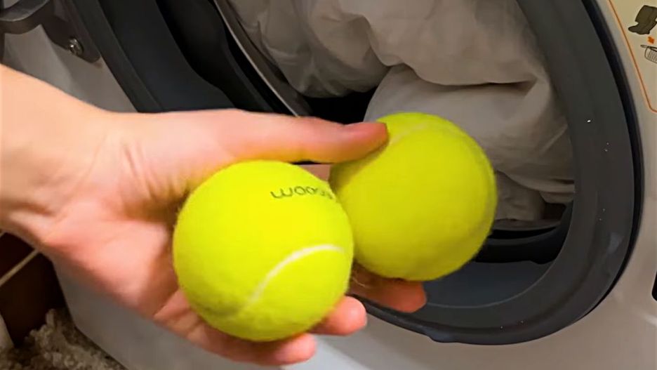 Ale tym razem oprócz nich włóż do bębna także 2 piłki do tenisa ziemnego.
