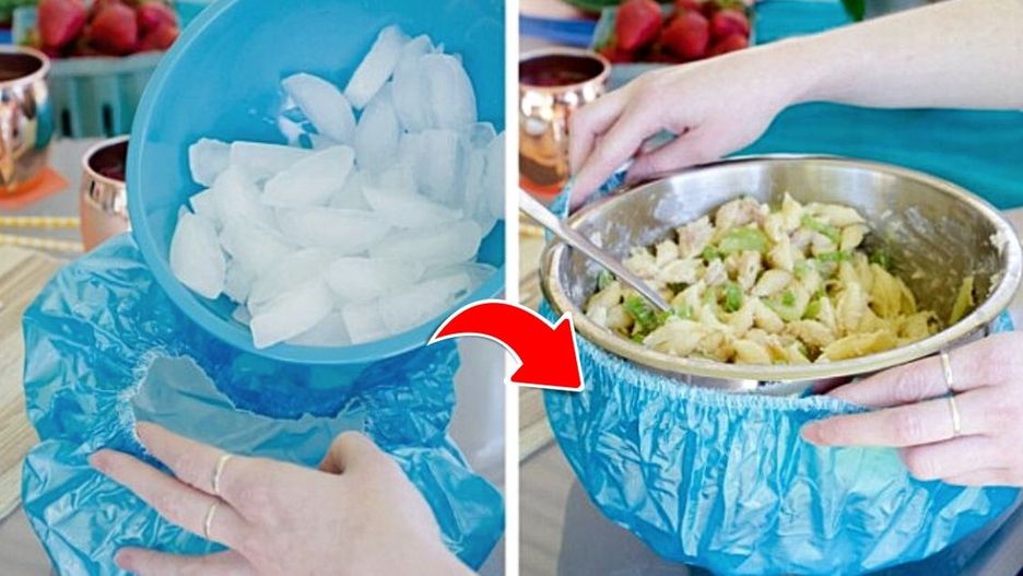 Do czepka kąpielowego nasyp lodu i połóż na nim miskę np. z sałatką.