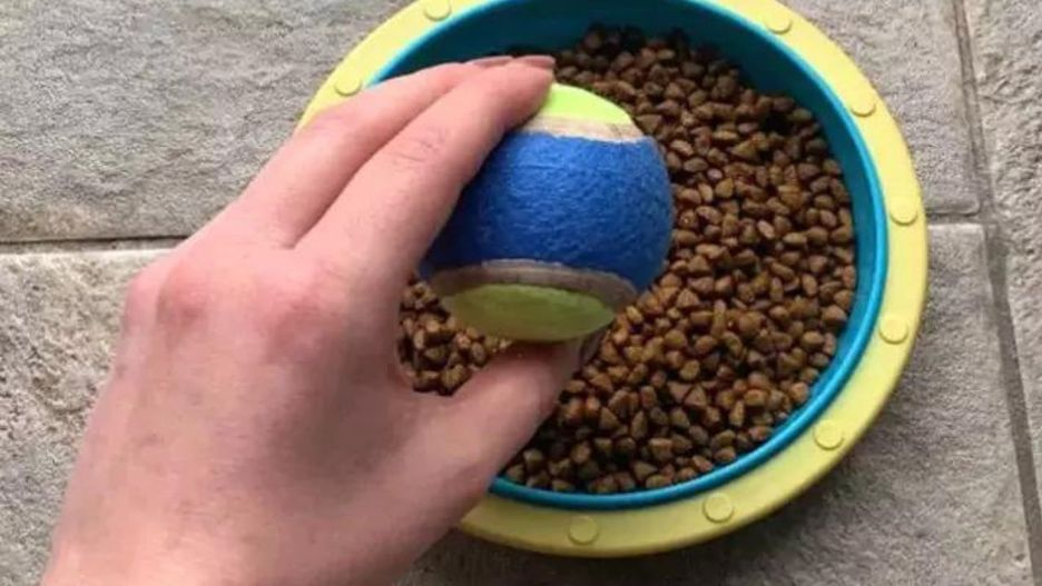 Zawsze wkładam piłkę tenisową do miski psa. Ten sposób pokazał mi weterynarz.