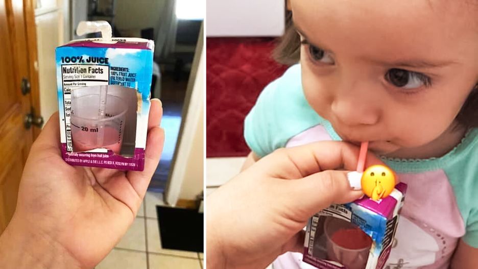 Kobieta wycięła niewielki otwór z jednej strony kartonika po soku do picia i umieściła w środku pojemnik z syropem. Następnie przebiła opakowanie słomką i podała napój dziecku. W ten sposób jej córka nic się nie domyśliła i chętnie wypiła lekarstwo! Trzeba przyznać, że taki trik jest naprawdę przydatny, zwłaszcza że jeszcze przed wypiciem syropu, wiele pociech grymasi na sam jego widok!