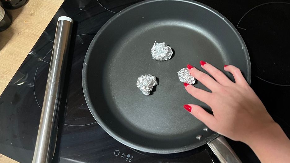 Połóż kulki z folii aluminiowej na rozgrzaną patelnię. Dzięki nim gotowanie będzie prostsze!