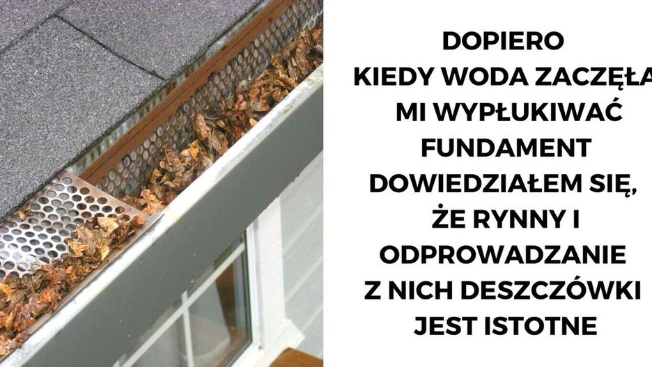Uważaj na wodę i odpływy. Zatkane rynny mogą doprowadzić do naprawdę kosztownych napraw. W moim przypadku okazało się, że rynny były tak źle podprowadzone, że wypłukiwały mi fundamenty. Dobrze, że zdążyłem zareagować przed katastrofą, ale i tak musiałem zapłacić nie mało, przeprojektowując cały system.