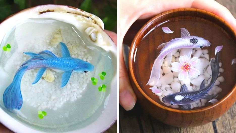 Feif Dong to chińska artystka, która wykonuje zachwycające wizerunki ryb, smoków oraz karpi koi. Powstają one w żywicy epoksydowej tworzącej przezroczystą, gładką powierzchnię. Dzięki niej zwierzęta wyglądają jakby pływały w wodzie bądź unosiły się w powietrzu. Te wyjątkowe ozdoby tchną orientem.