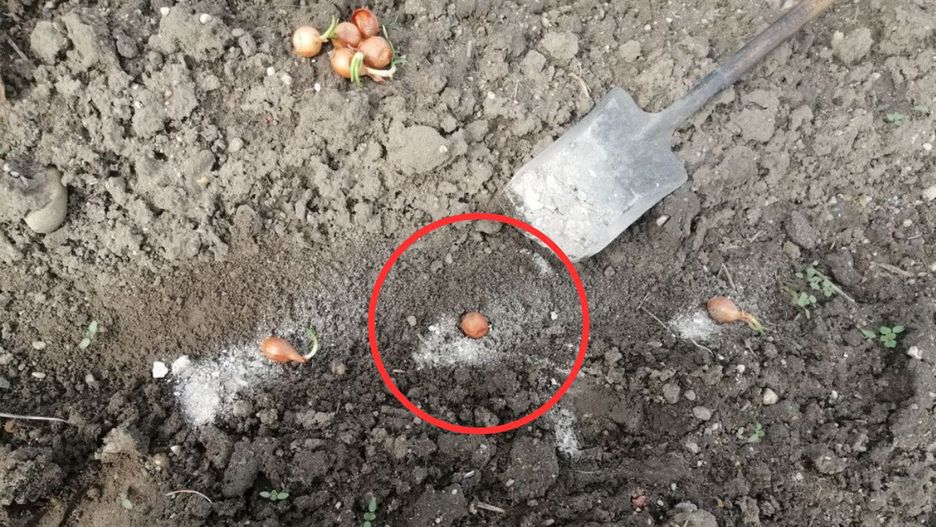 - Weź cebulki i wciskaj je w ziemię z popiołem w odległości 5-8 cm od siebie.