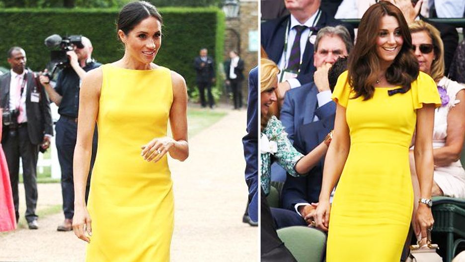 Sukienki o prostym kroju i intensywnym kolorze świetnie nadają się na wiele okazji, zarówno tych codziennych jak spacer z dziećmi jak i bardziej eleganckich. Meghan pojawiła się w żółtej kreacji w Commonwealth Youth Challenge, a kilka dni później księżna Kate założyła podobną sukienkę na finał męskiego Wimbledonu. Nie można jednak posądzić jej o plagiat, ponieważ wcześniej również można było zobaczyć ją w podobnych strojach m.in. podczas 3-tygodniowej trasy w Nowej Zelandii i Australii.
