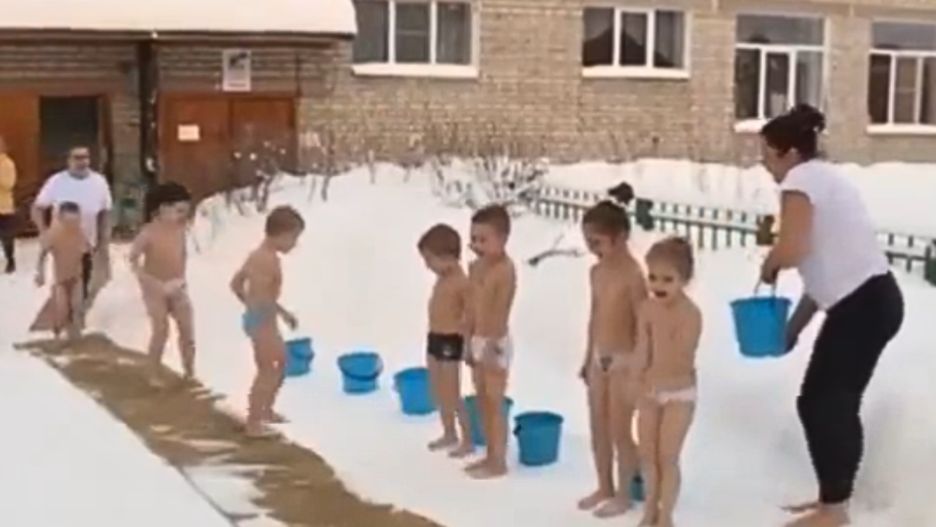 W rosyjskich przedszkolach dzieci nie tylko uczą się i bawią, ale również poddawane są praktykom mającym na celu wzmocnienie ich układu odpornościowego. Maluchy boso i w samych majtkach są zabierane na zewnątrz, nawet podczas mrozu, i polewane zimną wodą.