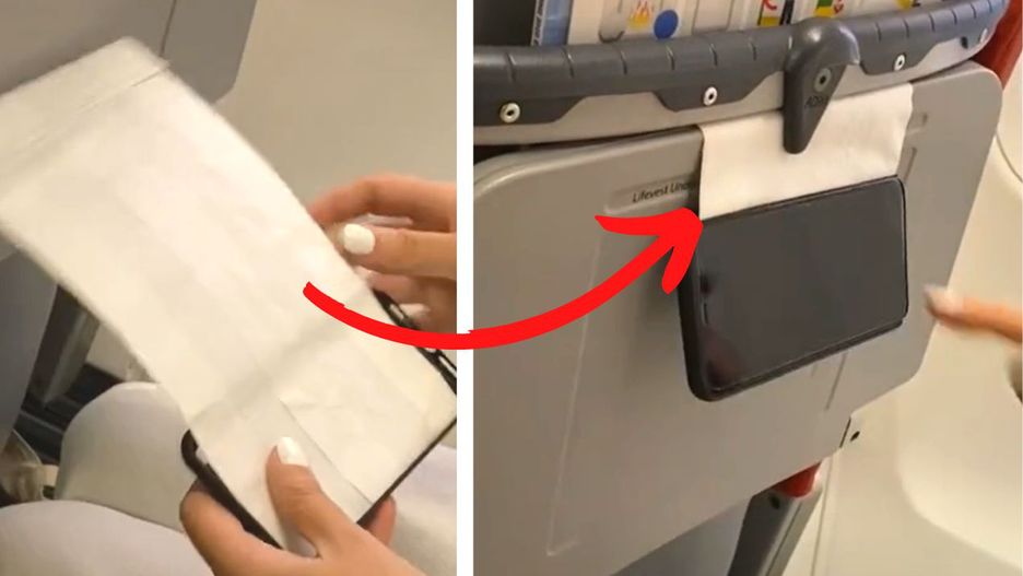 Sprawdź, czy zrobiłeś to na tyle dobrze, że jak chwycisz za papier, to nie wysunie się on z etui. Nie chcemy, by się niechcący uszkodził. Następnie zaczep krawędź torebki o złożony stolik na siedzeniu przed Tobą tak, jak zrobiła to kobieta na TikToku: