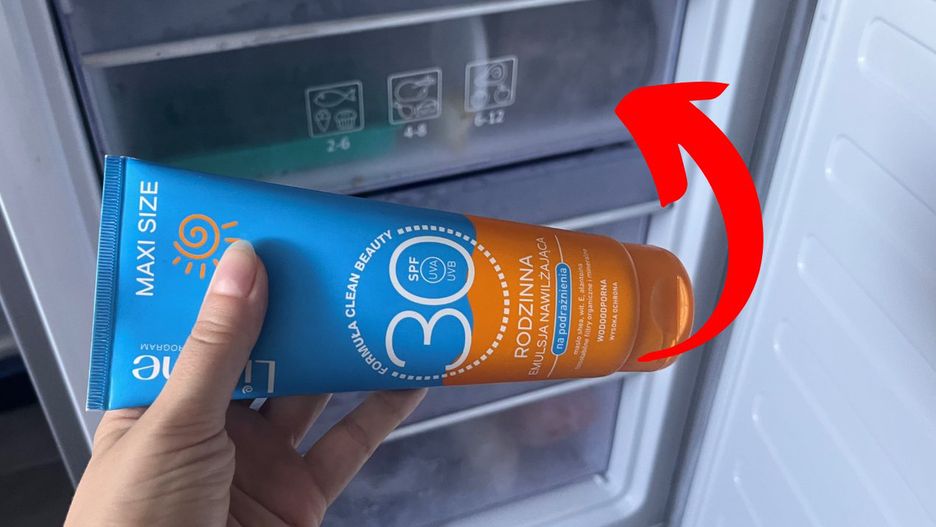 W okresie wakacyjnym w sieci można znaleźć najróżniejsze sztuczki, które ułatwiają plażowanie. Jedną z nich jest trik z kremem do opalania. Aby kosmetyk podczas ponownej aplikacji na plaży przyjemnie chłodził skórę, możesz go... zamrozić. Wieczorem wyciśnij krem z tubki do foremki do lodu i włóż do zamrażarki. Następnego dnia kostki kosmetyku będą gotowe do zabrania na plażę. Jeśli będziesz trzymał je w cieniu lub przechowywał w torbie izolacyjnej, zachowają niską temperaturę przez ok. 3 godziny. Przyjemnie ochłodzą skórę podczas ponownej aplikacji preparatu.