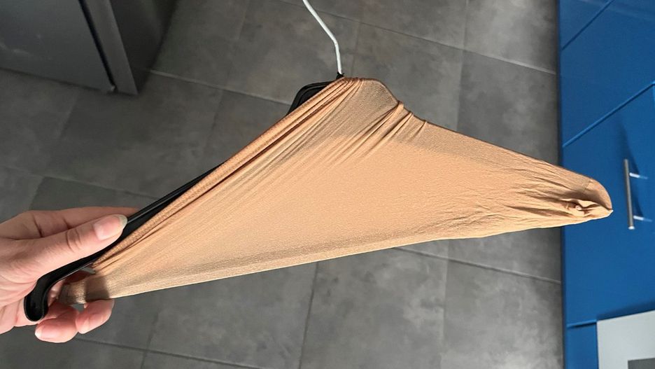 Aby wykorzystać ten prosty i genialny trik na sprzątanie pod meblami, przygotuj wieszak i starą, nylonową skarpetkę. Pamiętaj, że wieszak powinien być jak najcieńszy. Najlepiej sprawdzą się wydawane w pralniach wieszaki z drutu, ponieważ zmieszczą się w każdej szczelinie. Te plastikowe lub drewniane mogą okazać się za grube. Naciągnij materiał na wieszak. Zrób to w taki sposób, by skarpetka zakrywała obydwa "ramiona" i dobrze się na nich trzymała. Jeśli nie masz w domu skarpetki, którą mógłbyś wykorzystać do sprzątania, zastąp ją zwykłą ściereczką. Możesz przymocować ją do wieszaka, używając taśmy klejącej. Taką konstrukcję możesz wykorzystać, by zebrać kurz spod kanapy czy spod pralki. Aby osiągnąć lepszy efekt i nie przesuwać brudu z miejsca na miejsce, zwilż delikatnie materiał na wieszaku. Dzięki temu kurz i resztki jedzenia będą lepiej do niego przylegać.
