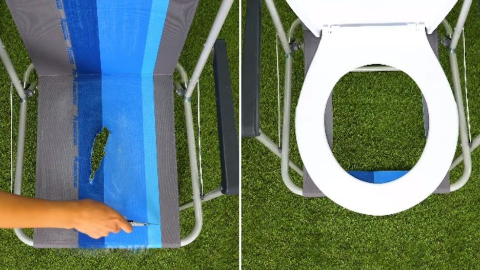 Weź stare składane krzesło plażowe. Używając nożyka do tapet wytnij z niego kawałek tkaniny. Następnie za pomocą trytytek zamocuj deskę klozetową, a korzystając ze spinaczy przyczep worek na śmieci. Tak przygotowaną toaletę spakuj ze sobą i zabierz pod namiot.
