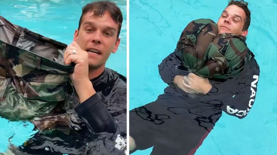 "Możesz sporządzić coś na kształt koła ratunkowego używając swoich spodni. Kiedy już je zdejmiesz, zwiąż dwa końce spodni razem w ten sposób, jaki jest pokazany na filmiku. Następnie zapnij je i - to jest najtrudniejsza część - postaraj się "złowić" do nich jak najwięcej powietrza. Teraz musisz tylko przełożyć przez powstały z nogawek otwór głowę i w ten sposób otrzymałeś prowizoryczne koło ratunkowe, które pomoże Ci się utrzymać na powierzchni".