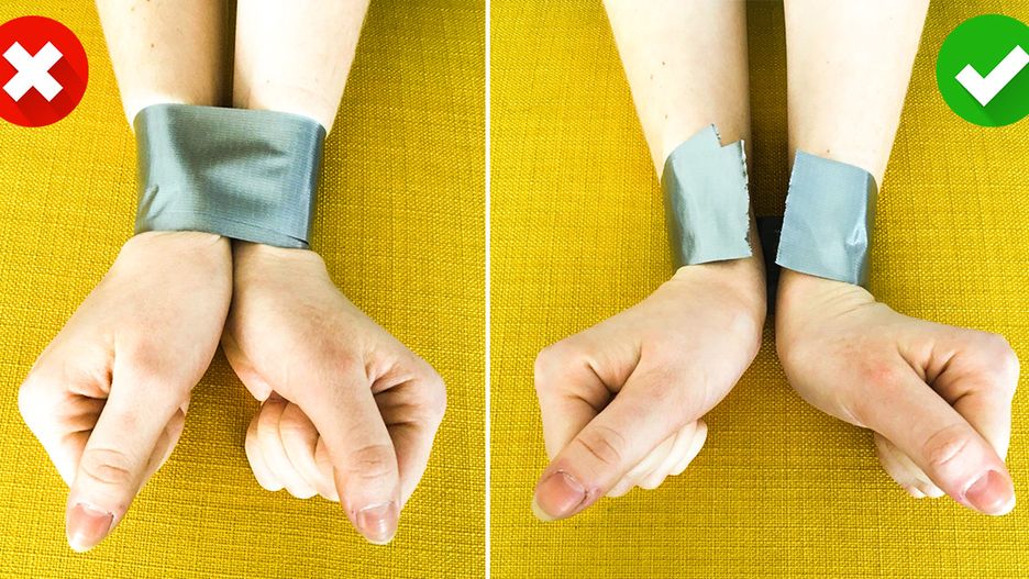 Wiele osób zamiast kajdanek używa plastikowych opasek zaciskowych czyli trytek. Są równie skuteczne jak prawdziwe kajdanki i wydaje się, że ciężko jest się z nich wydostać. Okazuje się, że w prosty sposób można się ich pozbyć. Podnieś ręce nad głowę, a następnie szybkim ruchem wysuń je przed siebie, jednocześnie tworząc nacisk na trytki. Takie działanie z pewnością sprawi ból, lecz pomoże Ci się uwolnić.