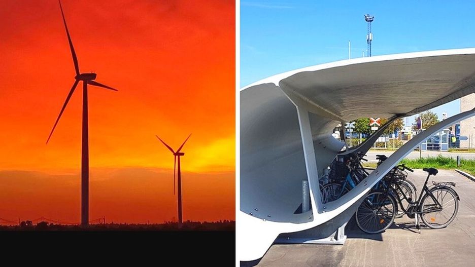 Duńczycy właśnie zaczęli wchodzić w okres, w którym kończy się czas eksploatacji wielu "wiatraków", a to oznacza niezmierzoną ilość odpadów. Badacze z różnych instytutów mnożą więc pomysły jak można by części turbin wiatrowych recyklingowo wykorzystać by zmniejszyć ilość odpadów. Najnowszym pomysłem jest przekształcanie łopat turbin w wiaty rowerowe (jak widać na zdjęciach). Planuje się także w najbliższej przyszłości wykorzystać je do budowy kładek dla pieszych, skateparków oraz ekranów akustycznych dla ruchu drogowego.