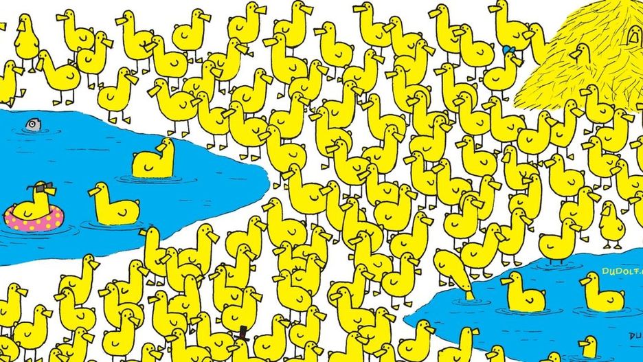 Mały kurczaczek zmieszał się w duże stado kaczek. Odszukać go potrafią nieliczni