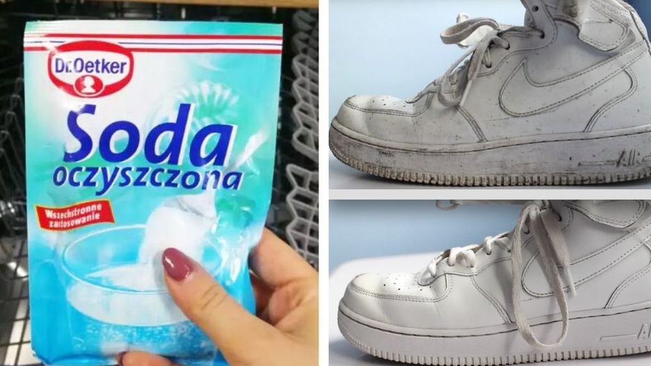 Wymieszaj 2 łyżki sody oczyszczonej, 1 łyżkę wody utlenionej i 1 łyżkę wody. Uzyskaną mieszaninę nałóż na białe buty (lub jasne podeszwy kolorowego obuwia) i wyczyść je za pomocą szczoteczki. Na końcu opłucz je dokładnie. Będą wyglądały jak nowe.