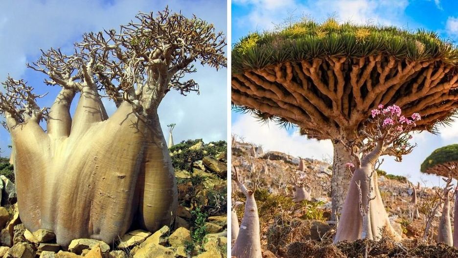 Na Sokotrze można podziwiać m. in. drzewa smoczej krwi, które dają czerwony sok, a kształtem przypominają otwarty szeroko na wietrze parasol