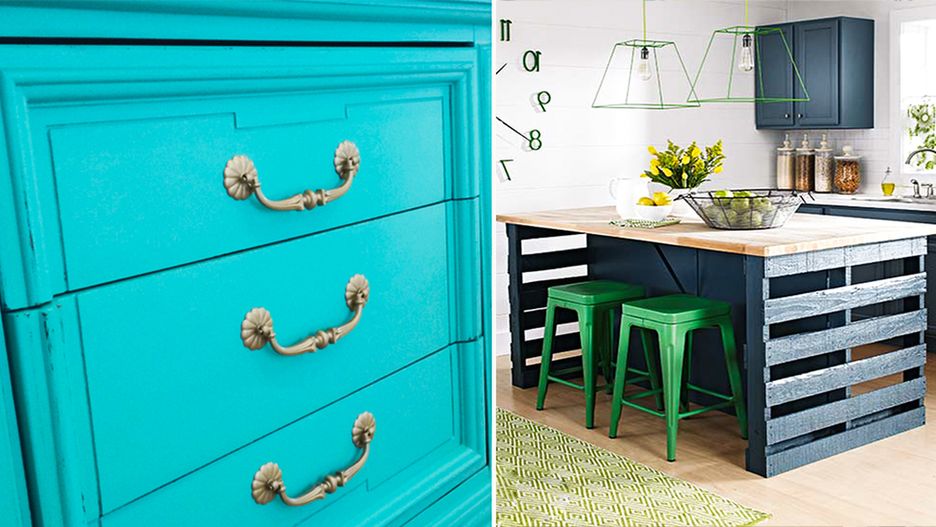 Z drewnianych palet można zrobić łóżko, szafki, a nawet kuchenną wyspę. Palety, wsporniki oraz płyty pilśniowe zostały pomalowane, a następnie ze sobą połączone. Na koniec został dodany solidny, drewniany blat.