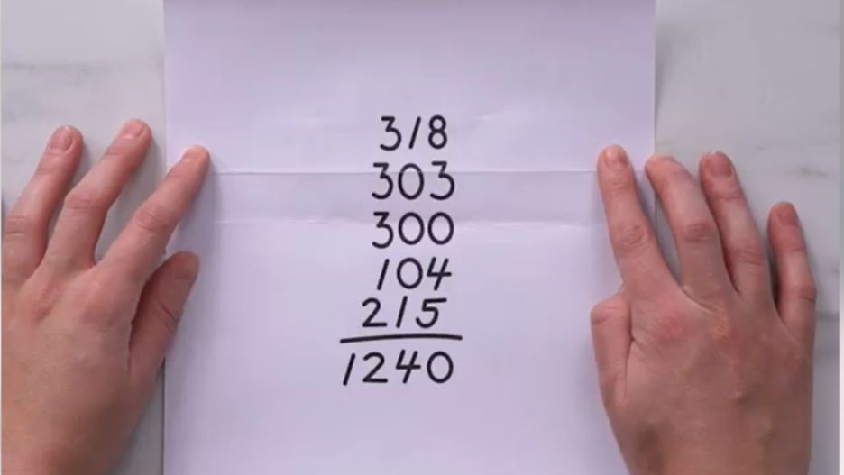 Poniższa zagadka wymaga od nas logicznego myślenia i sprytnego sposobu. Przygotuj kartkę i długopis, a następnie zapisz kolejno od dołu działanie w słupku: 1240|215,104,300,303,318. Jak sam widzisz, jest ono nieprawdziwe, gdyż zsumowanie tych liczb daje kompletnie inny wynik. Twoi towarzysze muszą wymyślić sposób na to, by wynik był poprawny, ale nie mogą używać długopisu do dopisywania i skreślania liczb. Odpowiedź jest niezwykle zaskakująca!